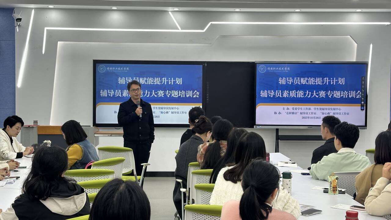 为全面深入学习贯彻习近平新时代中国特色社会主义思想,进一步加强我校辅导员队伍专业化、职业化建设,全力做好辅导员素质能力大赛省赛的备赛工作,10月28日,学生工作部于经开区校区2201智慧教室精心组织开展了辅导员赋能提升计划——辅导员素质能力大赛专题提升培训。