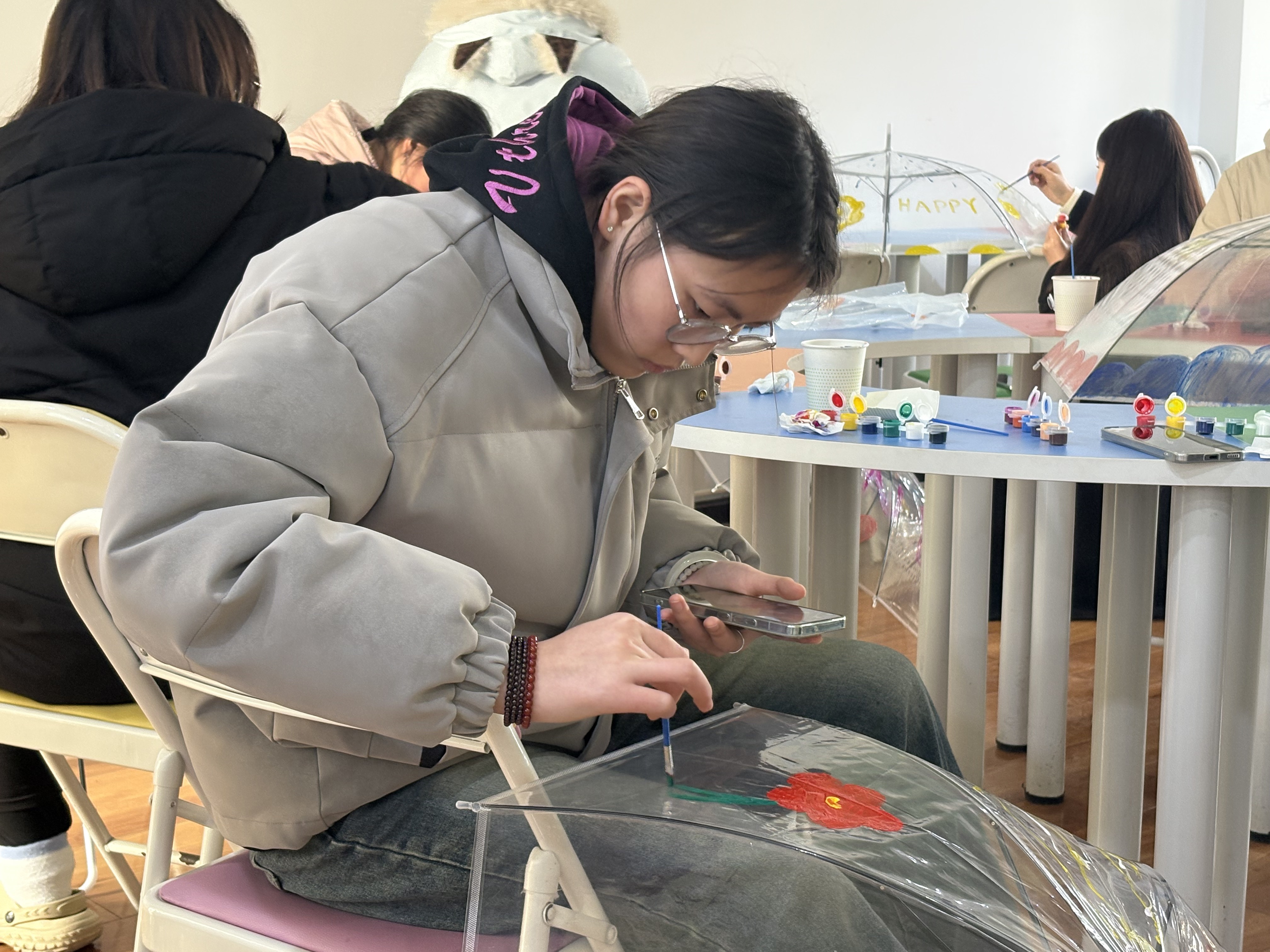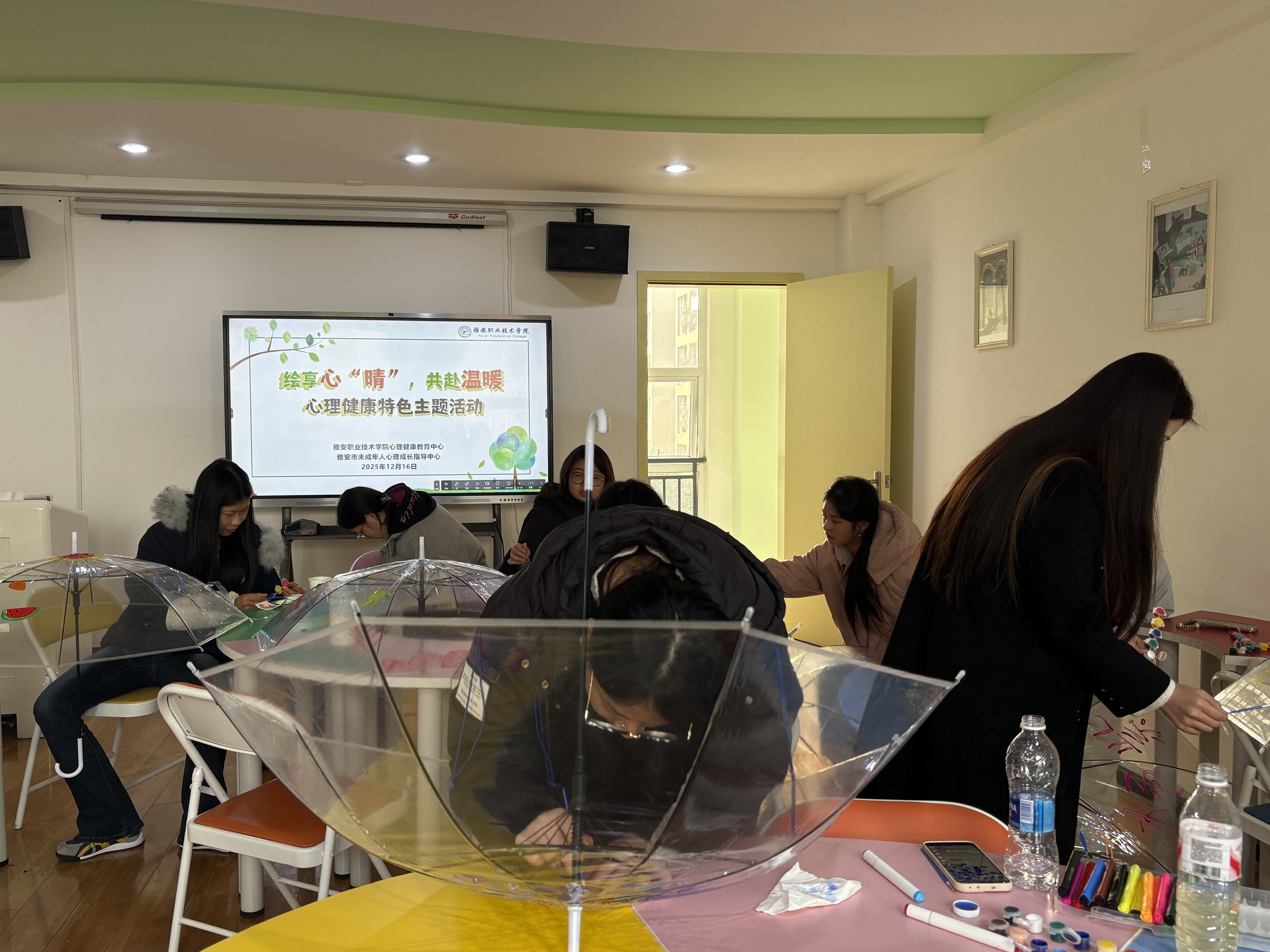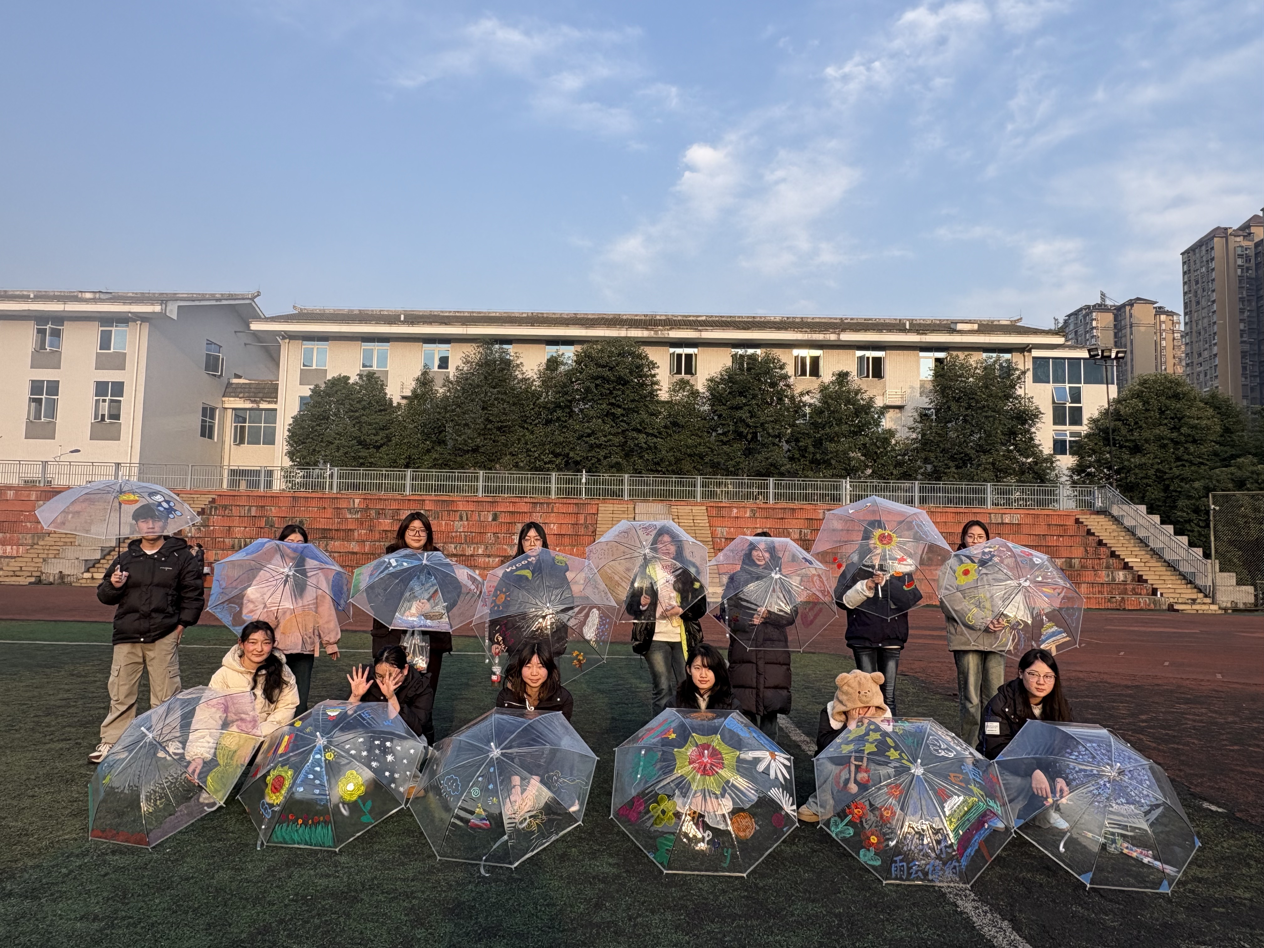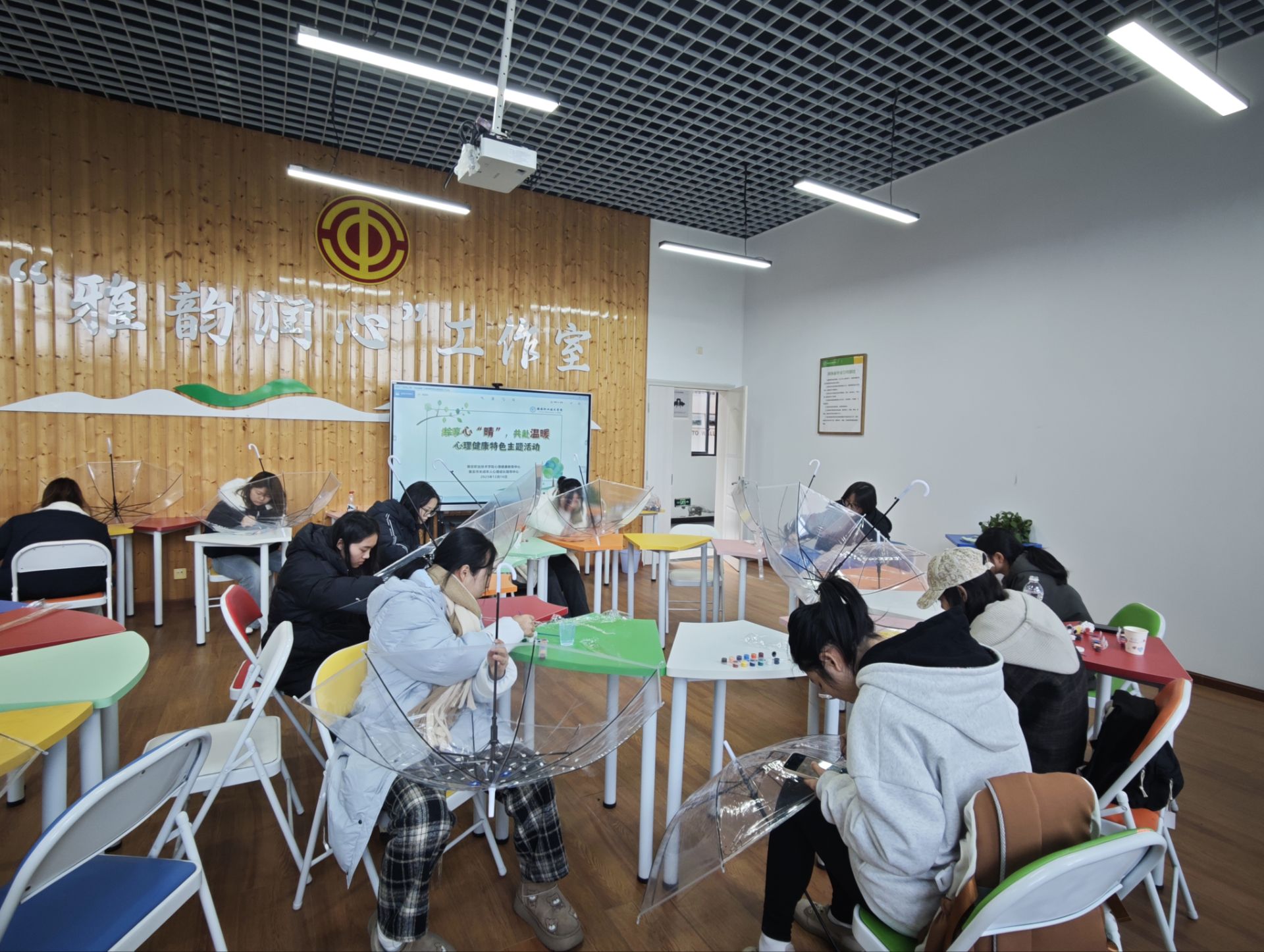 本次活动以彩绘透明雨伞为艺术疗愈载体,旨在通过色彩与创意表达解锁情绪出口,搭建同辈支持桥梁,助力学生在温暖互动中悦纳自我、拥抱生活。迎着冬日暖阳,活动在心理中心教师的带领下以“心灵天气猜猜猜”暖场破冰、导入主题,参与学生围绕主题完成雨伞彩绘,并交流分享作品背后的情绪故事,引导学生在活动中感受自我、疏导情绪,在分享中共享温暖、积蓄力量。学生们积极参与、沉浸其中,纷纷表示能量满满、意犹未尽,将带着这一份温暖与美好感受继续前行。