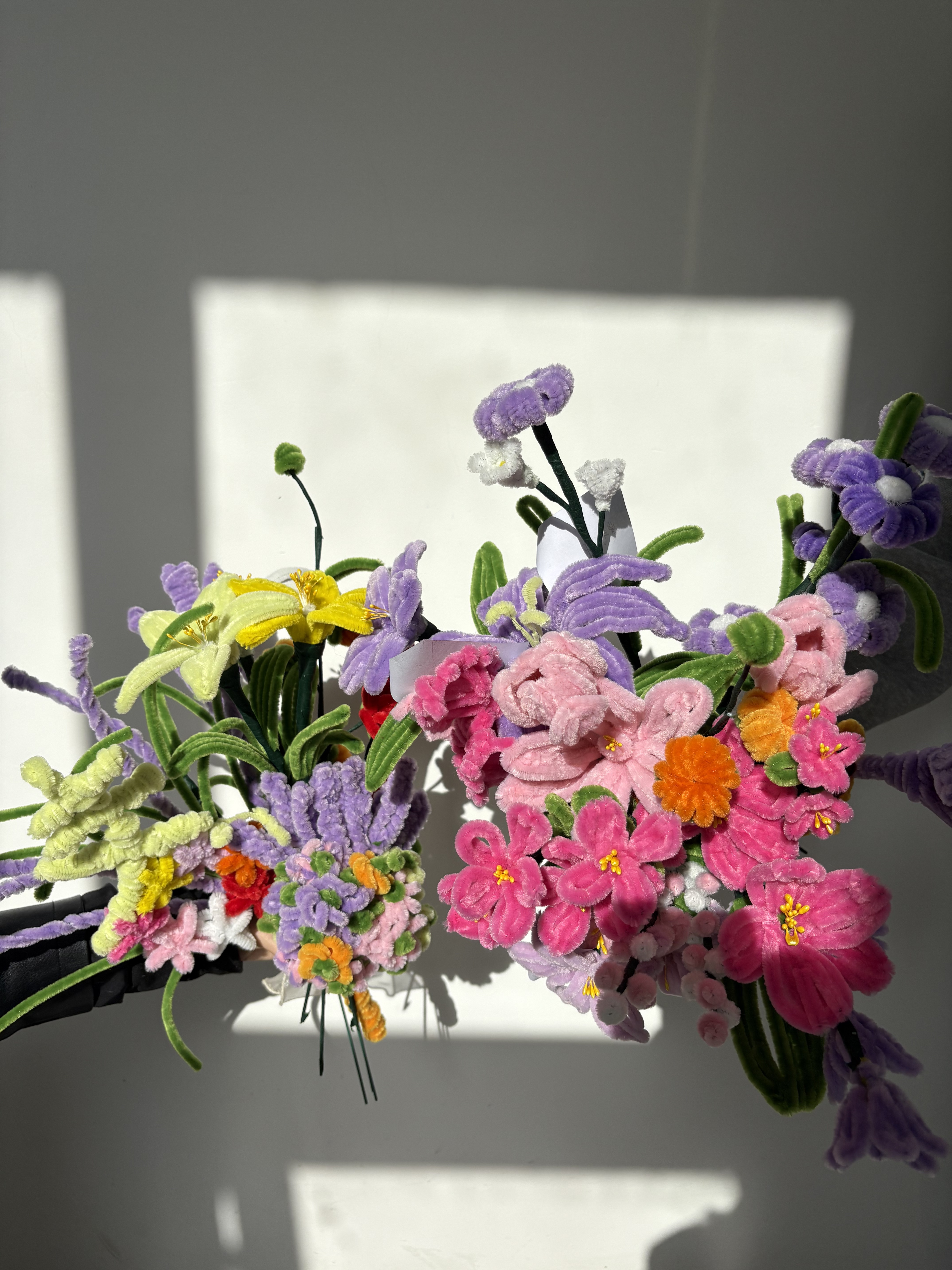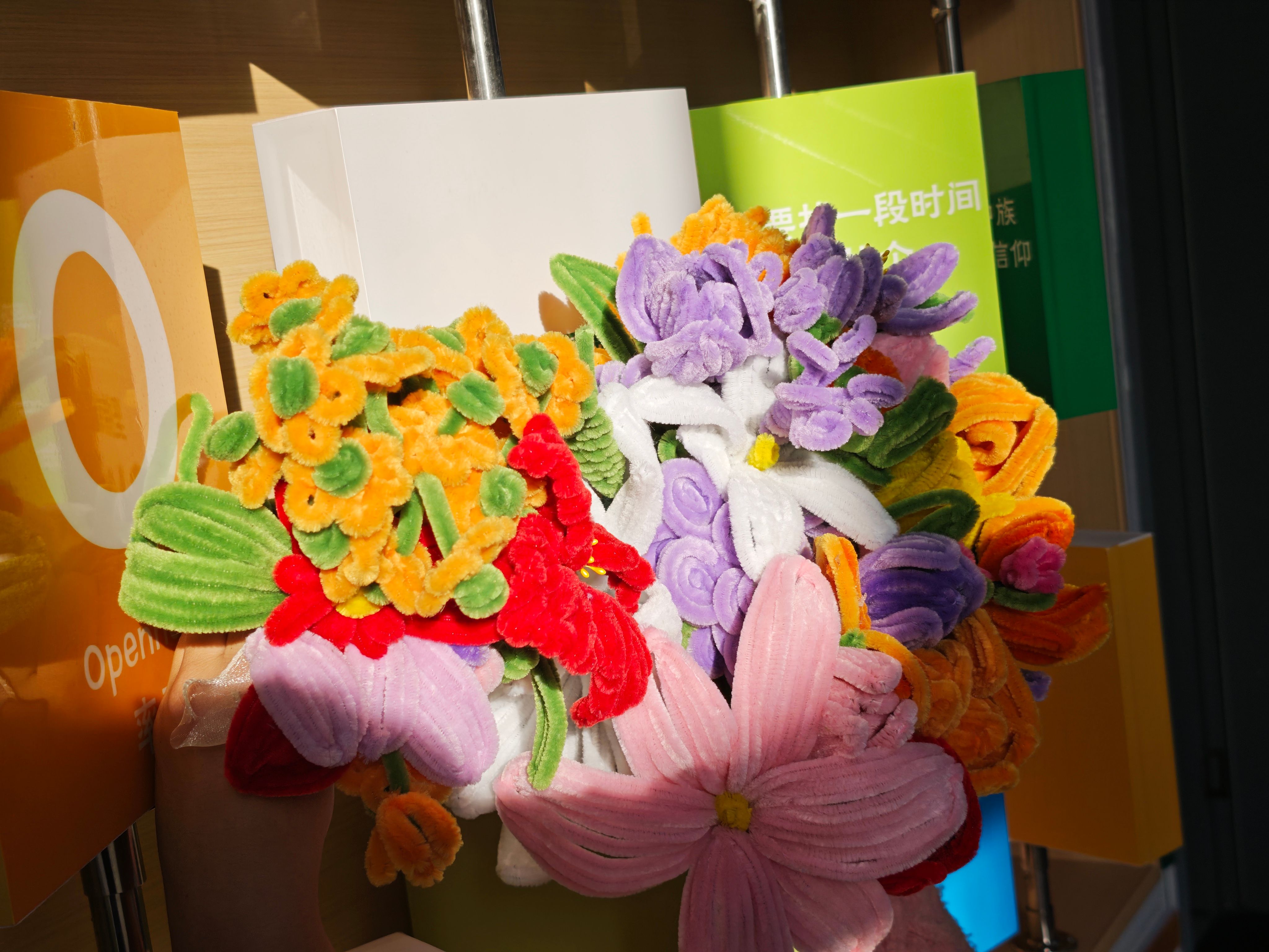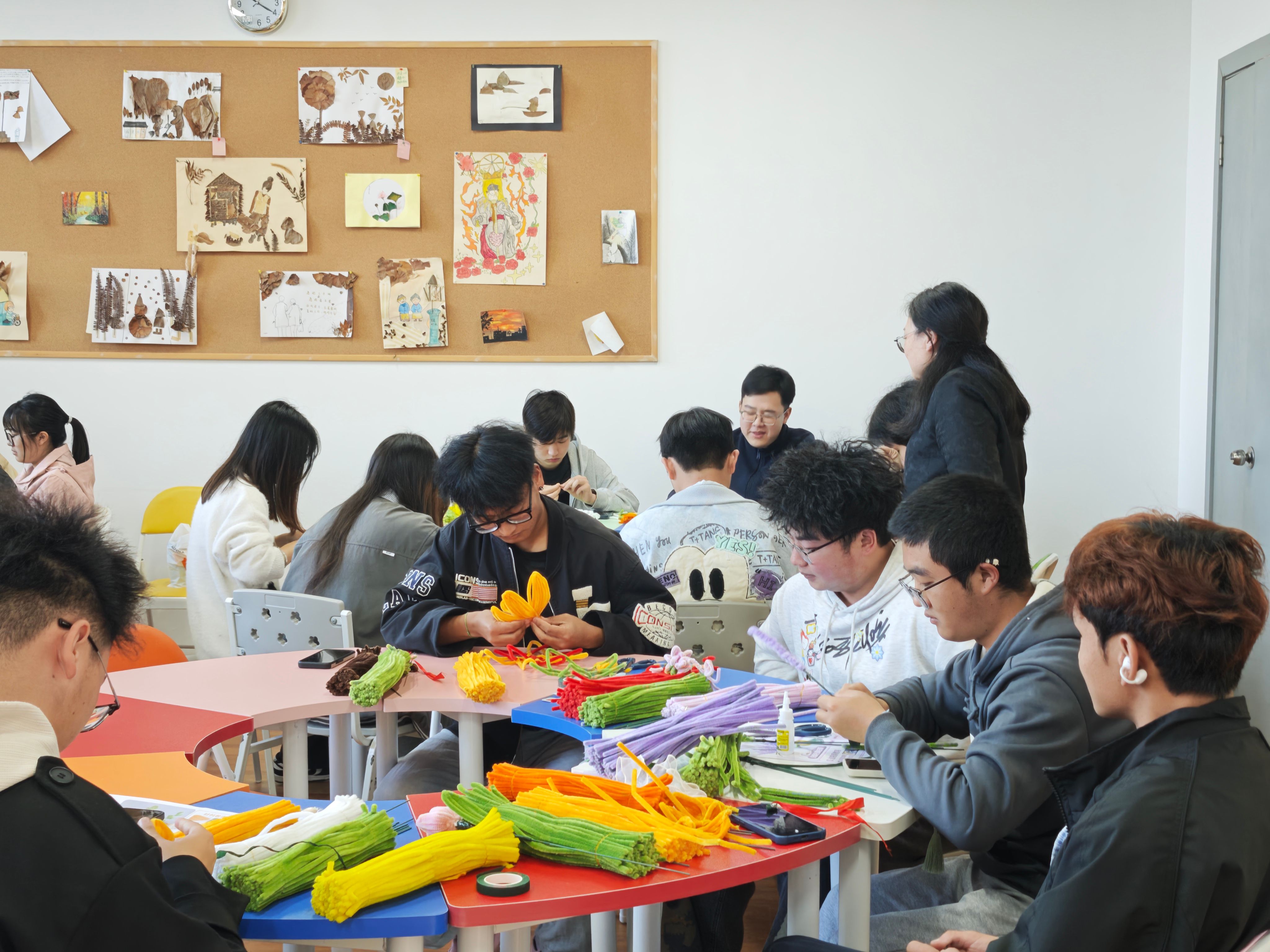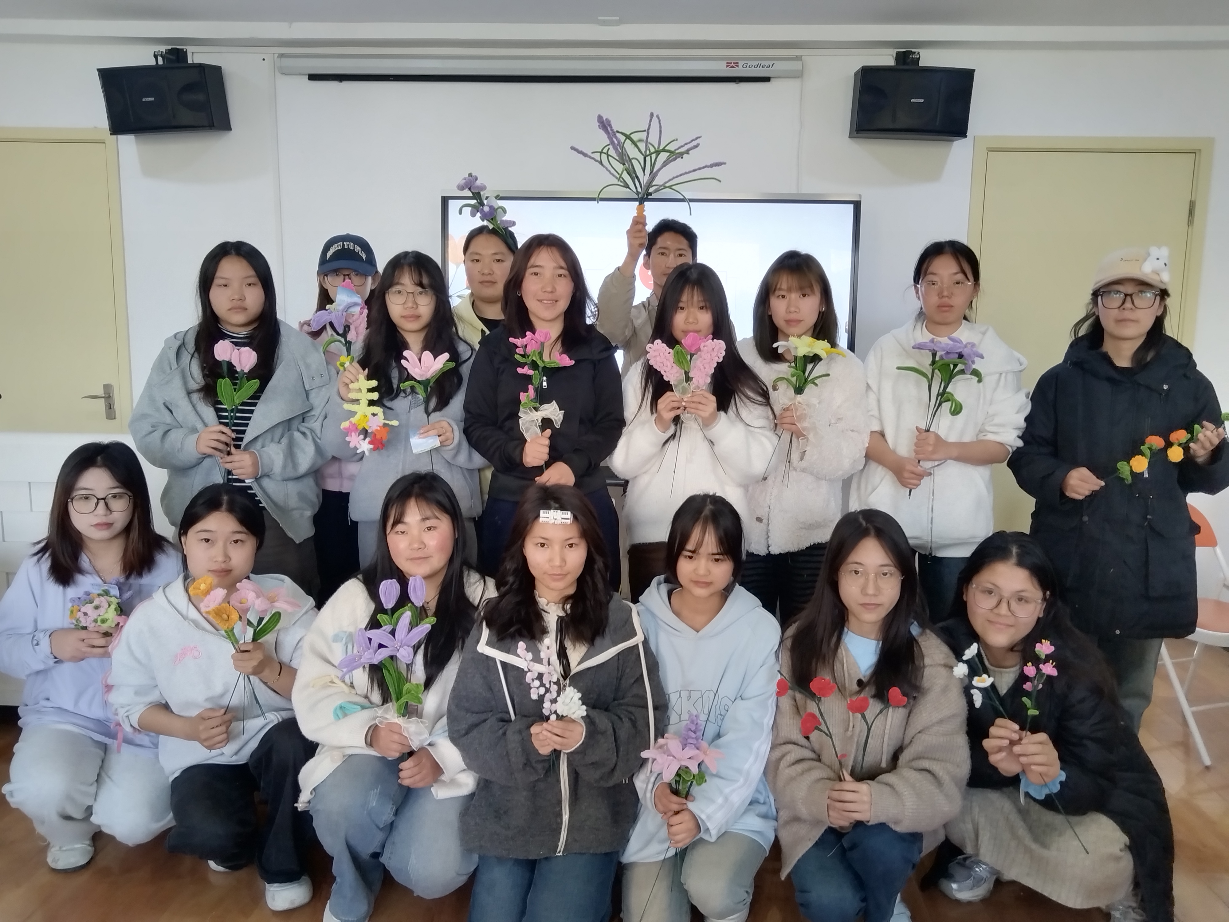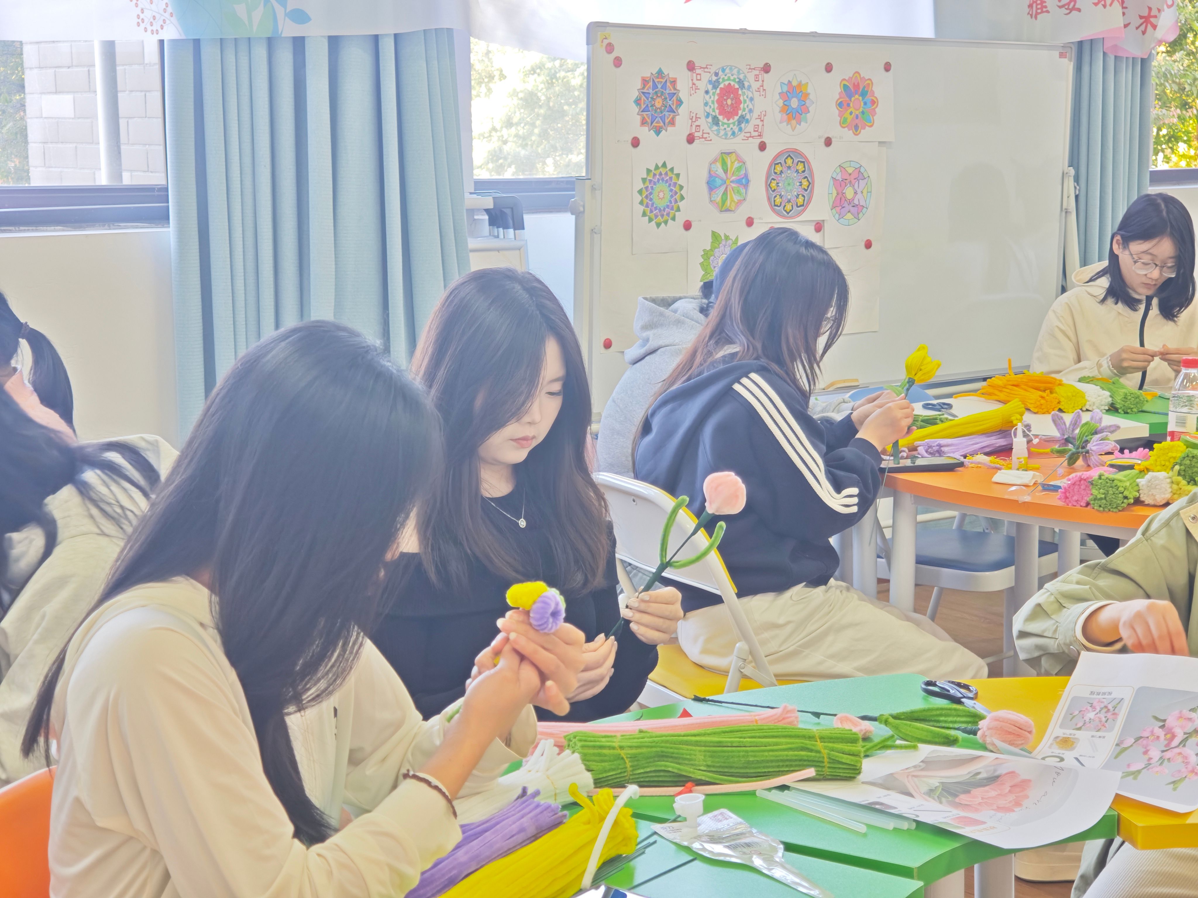 本次活动依托花朝节传统文化,紧密围绕“5·25”心理健康月的核心主旨,将艺术疗愈与朋辈支持融为一体,引导学生在手工创作过程中纾解焦虑、沉淀思绪,在手工创作的过程中舒缓压力、认知自我,体验“慢节奏”带来的心理疗愈效果。活动设置“寻花·入场”“绽花·体验”“传花·联结”“成花·延续”四个环节。学生在“寻花·入场”环节通过情绪色彩完成签到,并运用扭扭棒进行心情表达;“绽花·体验”环节,学生在心理老师指导下,动手制作向日葵、郁金香等花束,自由发挥创意进行编织,沉浸式感受手工疗愈的魅力;在“传花·联结”环节,学生分享各自的“花语故事”,借由作品表达情绪、梳理内心状态,通过“以花易花”的形式促进情感交流,使善意与鼓励在朋辈群体中传递;在“成花·延续”环节,学生留存亲手制作的花束,并写下对自身的期许与承诺,以花为媒,与未来达成温暖约定。